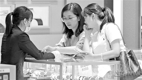 8月5日,游客在中免集团海口日月广场免税店选购商品。