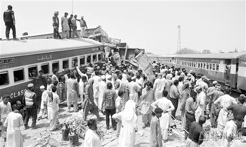 8月6日,人们聚集在巴基斯坦南部信德省桑克尔地区的列车脱轨事故现场。