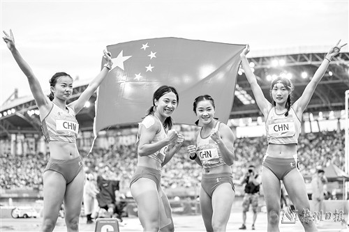 当日,在成都举行的第31届世界大学生夏季运动会田径项目女子4x100米接力决赛中,中国队以43秒70的成绩获得冠军。(新华社发)