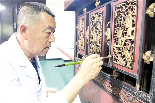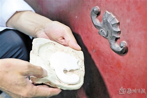 在瓷器修复组旁边,一块长约2米的红色牌匾吸引了记者的目光。“这是同治皇帝授予清代官员叶舒华的圣旨匾,我们接手时发现有匾额开裂、脱色、虫蛀、缺损等症状,经过修复,目前已达到较好的展陈效果。”赵钰的老师、木制组修复师高学峰说。据介绍,高学峰曾在包头博物馆工作,从事考古和文物修复工作有30多年,参与了瓷器、青铜器、铁器、石制文物等的修复工作。在梅州的一个多月里,他先后完成了三块匾额、一顶官轿及四十多件木质文物的修复。