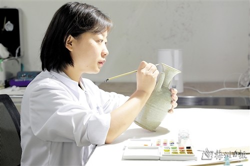 字画修复室旁边是陶瓷器修复室,陶瓷文物修复师赵钰正在给一件唐代水车窑执壶着色,手边放置的修复工具多达十余种。“水车窑是梅州最具代表性的瓷器之一。”赵钰刚拿到手中这件文物时,瓷器表面有污渍且釉质疏松,有些部位的釉面已脱落,坯体外露。经过表面清洗、加固、釉面封护、补全和上色等流程,使这件瓷器重焕光彩。