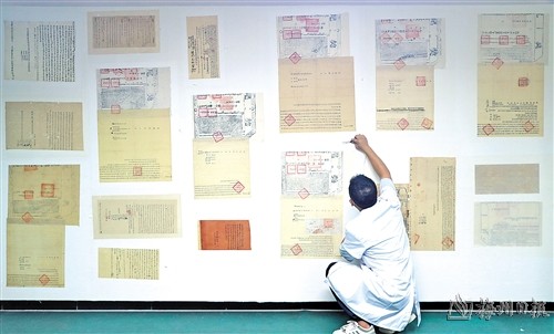 字画修复室的墙面上贴满了修复好的房契、婚书、拜师帖等纸质文物。