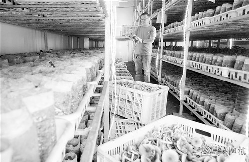 8月5日,工人在寿宁县下党乡下党村的食用菌产业园有机菌菇种植车间采摘茶树菇。