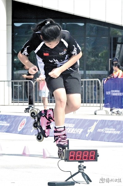 竞技赛场上,轮滑运动员脚踩“风火轮”,奋勇争先、激烈比拼,演绎了一个又一个“速度与激情”的瞬间(如左图,钟小丰摄)。比赛高潮迭起、精彩纷呈,赢得现场观众阵阵喝彩。除展现精湛技巧外,队员间还展现出良好的沟通协作能力,让比赛更具意义和观赏性。“我报名参加了速度过桩和团体轮滑拉龙比赛。轮滑运动不仅能强身健体,而且还非常有趣,有利于增强我们的交流协作能力。”来自汕尾的参赛选手雷以彤说。