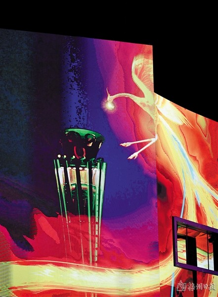 在人们的深情注目下,火焰缓缓熄灭,幻化成一颗闪亮的火种。腾空飞起的“太阳神鸟”衔起火种,传递到一名青年手中,然后盘旋上升飞向远方。