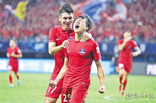 图为梅州客家队球员茹子楠庆祝进球。(林翔 摄)