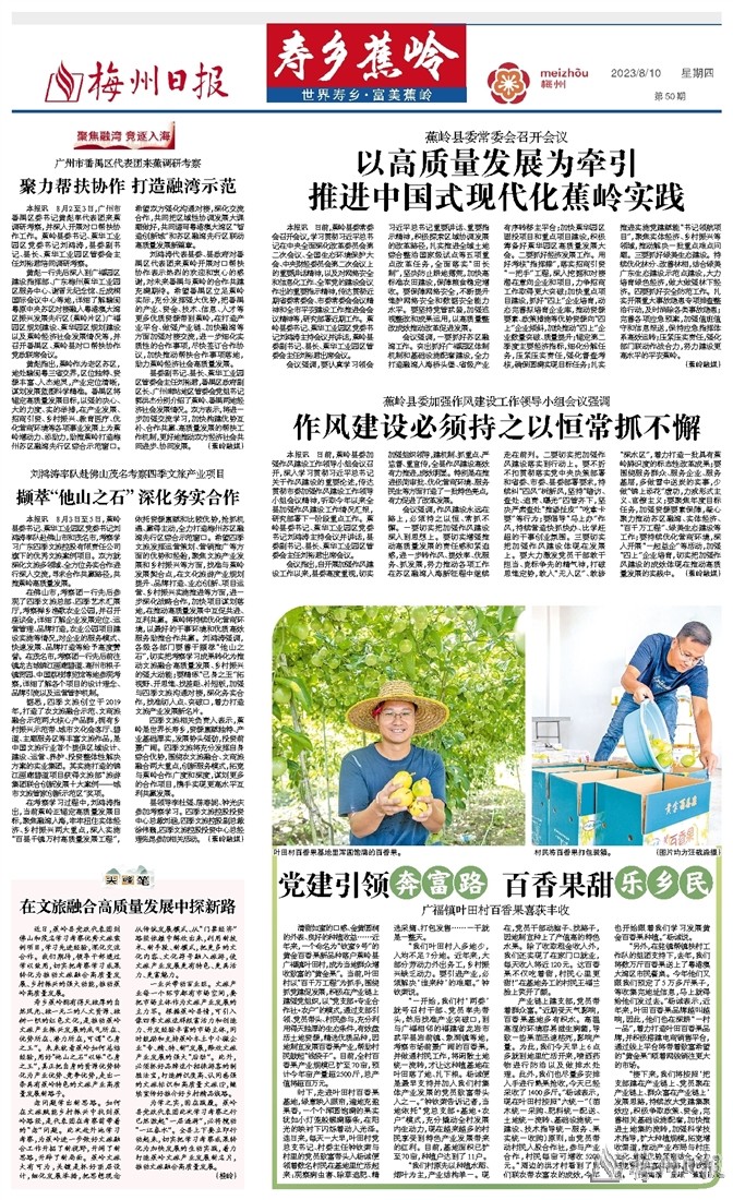 清甜如蜜的口感、金黄圆润的外表、良好的种植收益……近年来,一个命名为“钦蜜9号”的黄金百香果新品种落户蕉岭县广福镇叶田村,成为当地群众增收致富的“黄金果”。当前,叶田村以“百千万工程”为抓手,围绕抓党建促发展,积极在产业链上建强党组织,以“党支部+专业合作社+农户”的模式,通过支部引领、党员带头、村民参与,充分利用得天独厚的生态条件,有效盘活土地资源,精选优质品种,因地制宜发展百香果产业,帮助村民鼓起“钱袋子”。目前,全村百香果产业规模已扩至70亩,预计今年亩产量超2500斤,总产值将超百万元。