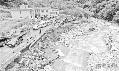在事发现场,河道旁的路基已经被洪水冲垮。有两间地处山谷地带的房屋被山洪和泥石流冲毁,其中一间房屋只残存两面砖墙,抢险救援人员正在清理被冲下山的泥浆和大石块。