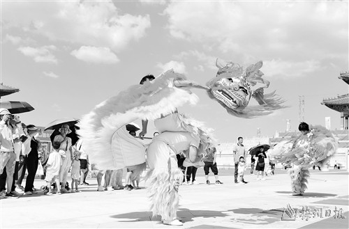 8月13日,在鄂尔多斯文化产业园景区,民间艺人表演舞狮。