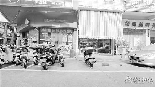 近日,记者走访城区多条道路,发现不少路边停车位被花式圈占。在梅江区三角镇吉祥路,记者发现该道路两侧均开有店铺,并施划有公共停车位,但几乎都停放了车辆,偶尔出现几个空闲车位,却被花式霸占:有的被停放了两三辆摩托车,有的则放置了砖块、水泥墩或栅栏……