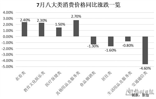 此外,受国家调整成品油价格因素影响,7月柴、汽油价格环比分别上涨2.1%和1.8%。综合影响下,非食品价格环比上涨0.4%。