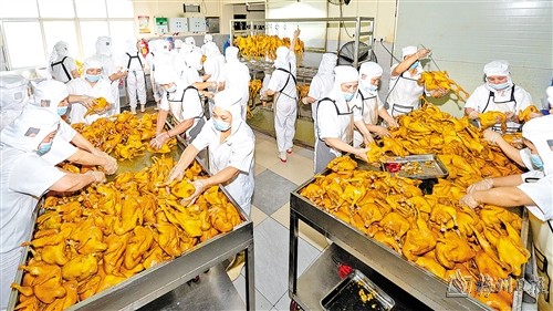 制作、筛选、精选、杀菌、包装……在兴宁贵食网络有限公司位于新陂镇的食品加工车间,工人们正有条不紊地操作着。“仅盐焗鸡制品这一块,我们就有手撕盐焗鸡、盐焗鸡爪、鸡翅、鸡胗、鸡皮、鸡脚筋、鸡冠等产品。每一件产品都经过严格的精选和杀菌,确保高品质。”贵食公司负责人告诉记者,高品质造就好口碑,目前该公司自主经营网店23家,孵化网店216家,日均上行量累计超10万单。