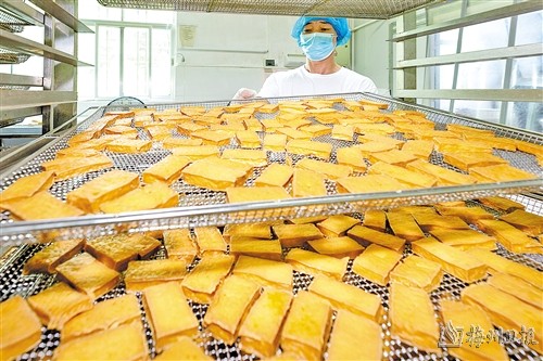 兴宁市大坪镇盛产好豆和好水,豆干香气在这里弥漫了500多年。2021年,梅一客公司力邀仲恺农业工程学院食品科学技术教授和布骆包子豆腐非遗传承人,合力担纲技术研发,创建“逗乐大菽”豆制品品牌,其生产的轻食豆干、豆干拌饭酱、低脂肪豆干等产品推向市场后深得消费者喜爱。“最关键的还是要把好质量关。我们建立了现代化SC认证生产车间,配备了先进的自动包装机和杀菌机。正因为如此,产品的储藏时间才得以从15天延长到60天。”张雪莲说。