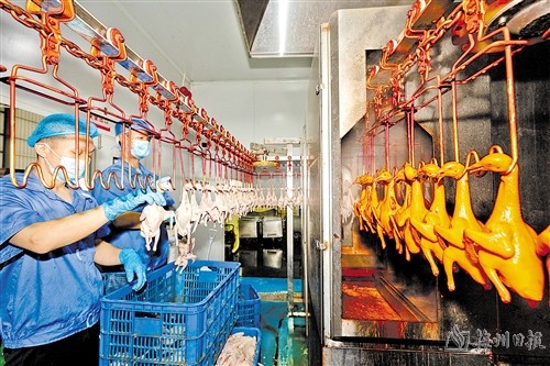 走进位于兴宁市的梅州市金绿现代农业发展有限公司肉鸽活禽屠宰车间和肉鸽休闲(预制菜)食品深加工车间,可以看到一只只肉鸽被送上生产线,经过十几道工序后,一份份肉鸽预制菜便可包装入库保鲜。