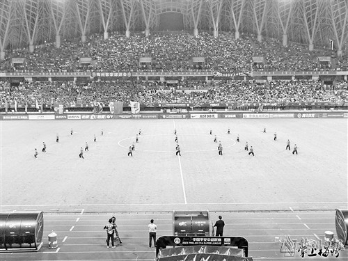 本报讯 8月8日19∶35,2023中国平安中超联赛第21轮,梅州客家坐镇主场五华奥体中心惠堂体育场迎战长春亚泰。恰逢8月8日是全民健身日,开赛前,赛事组委会与相关部门精心组织了太极功夫扇和少儿武术表演。