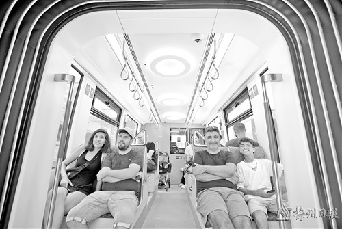 8月18日,在以色列城市特拉维夫,人们搭乘轻轨红线列车。(新华社发)
