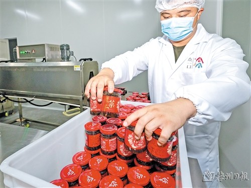 在叶塘镇汤湖村的一个车间内,空气中弥漫着独特芳香,一棵棵芥菜经清洗、修整、烫漂、晾晒、深加工,在生产线上“变”成一瓶瓶玻璃瓶装的酱菜(如下图,连志城摄)。为推动乡村振兴,叶塘镇把传统特色漉菜作为带动群众增收的主导产业之一,依托省级农业龙头企业兴宁市叶南渔村农产品开发有限公司,成立众一口食品科技(梅州)有限公司,借鉴酱菜先进地区做法,与广州工商学院、兴宁技校等开展校企合作,研发制作开瓶即食、易于保存的深加工食品,提升传统漉菜的文化价值和经济价值,打造叶塘独具特色的富民产业。
