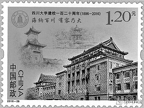 四川大学(1896-2016) 2016年发行的《四川大学建校一百二十周年》纪念邮票,以四川大学校徽、校训及建筑景观为元素,以钢笔淡彩的形式将其有机结合,表现了四川大学独特的风貌和深厚的文化底蕴。 |