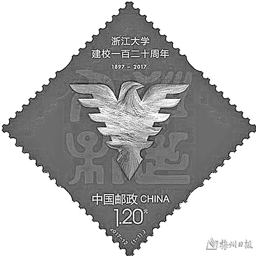 浙江大学(1897-2017) 2017年发行的《浙江大学建校一百二十周年》纪念邮票,构图上充分利用了菱形邮票的几何特性,以浙江大学一百二十周年校庆标识中的“七彩求是鹰”作为邮票的中心,置于校训“求是创新”之中,整体看来同时具有四角外扩的张力与四边内收的凝聚力,在创新中传承了浙大的文化。邮票的主色调采用了温暖而深沉的浙大蓝,体现出百年浙大“大不自多 |