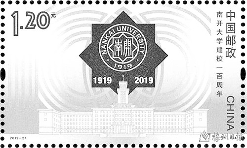 南开大学(1919-2019) 2019年发行的《南开大学建校一百周年》纪念邮票,邮票中心以南开大学早期校徽中的八角星形状为核心元素,结合新校徽、“青莲紫”校色、年份数字和南开大学八里台校区主楼形象,体现出南开大学百年沿革的历史感。在紫外灯下,取自校徽的“南开”校名和“允公允能 日新月异”的南开大学校训清晰显示。 |