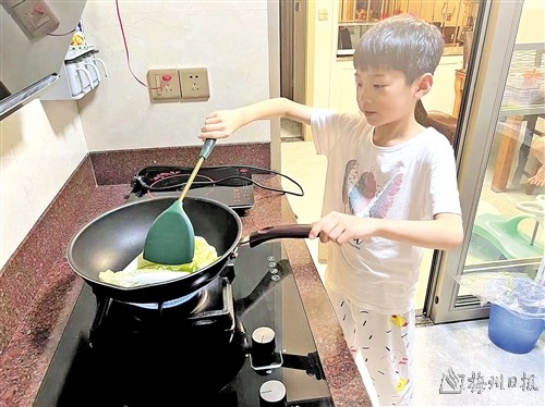 每天做家务、学会做一道菜……在学生们的暑假作业清单里,“做家务”一项也是频频出现。江南育才小学学生陈以洋变身“小厨神”,将自己亲手炒好的大白菜盛到盘子上,他告诉记者:“老师让我们要在假期学会做饭,这是一项很有意义的暑假作业,不仅锻炼了我的‘身手’,也为父母分担了家务。”陈以洋的母亲对此表示深深的赞同,她认为劳动实践类的暑假作业可以开阔学生的视野,增强学生对生活的认识,并在实践中提高他们自身的综合能力。“当然最重要的,是让孩子们度过了一个充实而快乐的假期。”陈以洋的母亲说道。