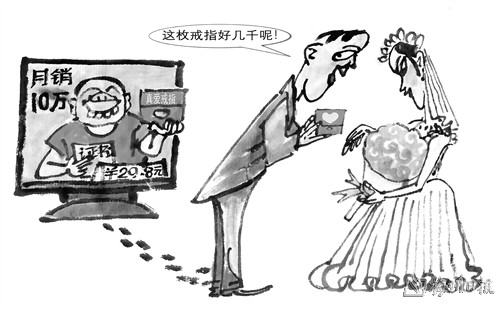七夕将至,电商平台上出现了一批“廉价求婚钻戒”。几十块钱的“DR钻戒”不仅可以定制配套的“真爱协议”,还能提供“珠宝鉴定证书”和“DR包装盒”。有媒体记者调查发现,这些商品的进货价,可能只有个位数。有网友认为,“月销10万+的背后,是10万+个受害的女生”“买这种假货骗人的就是在欺骗感情”。王成喜/图