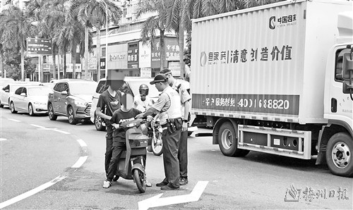 近日,记者跟随交警部门民警来到嘉应中路西桥红绿灯处开展整治工作,9时20分,两名没有佩戴头盔的男子共乘一辆共享单车,在机动车道的车流中穿梭,准备快速通过该路口。两名男子随即被执勤交警拦下,当告知其违法行为时,驾车男子表示自己的朋友不会骑共享单车,为了方便出行,就两人共同驾乘一辆共享单车。随后交警对其进行了普法教育,并根据道路交通安全法相关规定对其作出相应的处罚。