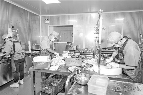 不仅如此,太乙崇光还投入150多万元引进先进速冻设备。用铝箔盒打包好的蕉岭三及第和其他预制菜,需立即放进速冻机。“30分钟内,速冻机能够把食品的中心温度冷冻至零下18摄氏度,保持原汁原味,减少营养流失,做到不添加防腐剂。”陈英龙说,这样速冻好的预制菜转置于食品冻库,可以保存6个月。