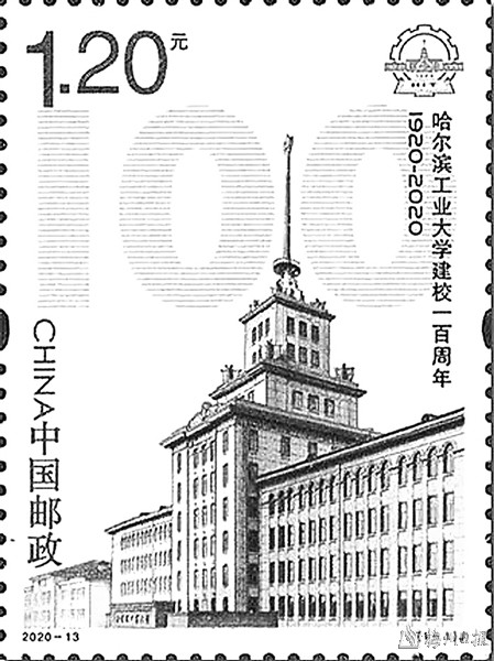 2020年发行的《哈尔滨工业大学建校一百周年》纪念邮票,以庄严、厚重的哈尔滨工业大学主教学楼为主体,设计构图严谨、层次简练有序,白色的背景衬托出雄伟壮丽的欧式教学楼建筑,凸显出哈工大悠久的历史、深厚的底蕴和辉煌的成就。紫外线灯光下观察,“规格严格 功夫到家”的校训跃然纸上。