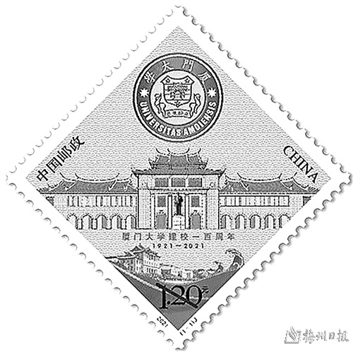 2021年发行的《厦门大学建校一百周年》纪念邮票,以厦门大学的标志性建筑之一 群贤楼群为主体,同时表现校徽、建南大会堂及海浪等元素,彰显出厦门大学深厚的历史底蕴。在荧光灯下凤凰花花团簇拥下的 “自强不息,止于至善” 校训跃然方寸之上。