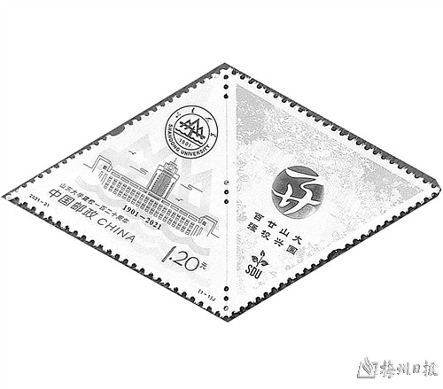 2021年发行的《山东大学建校一百二十周年》纪念邮票,创新性地采用平行四边形构图和左右分布的格局,形成“一票双图”的视觉效果,左侧画面以山东大学“图书馆”“知新楼”为主体,右侧画面以120周年校庆标识为主体,并衬以山大人熟悉亲切的校园环境作为背景,采用棕、金双色雕刻的顶级邮票印制工艺,以全新的画面、精湛的工艺,诠释出山东大学深厚的历史底蕴和鲜明的文化特色。