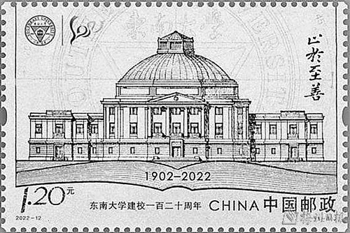 2022年发行的《东南大学建校一百二十周年》纪念邮票,以东南大学早期大礼堂的手绘建筑图为核心元素,下方以展开的书本、建校时间等为烘托,寓意“百廿名校、教书育人”,背景为东南大学标志的标准制图,与校徽、“120”校庆标志、校训等元素协调搭配,整体画面结构严谨、色调沉稳厚重,衬托出百廿名校的悠久历史与深厚底蕴。