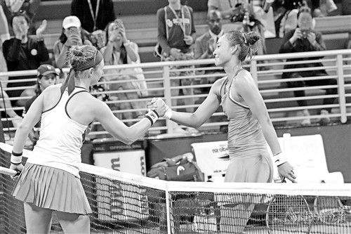 8月29日,郑钦文(右)与波多罗斯卡在比赛后握手。