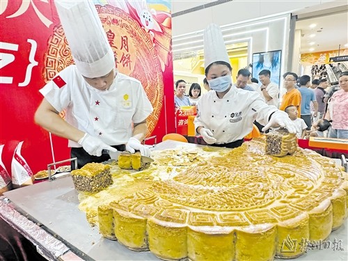 本报讯 (记者张莹娜)距离中秋佳节还有不到一个月的时间,梅城街头弥漫着月饼的香味。9月2日晚,一个直径达1米、重约200斤的月饼在梅城万达广场展出(如上图,张莹娜摄),吸引了众多市民驻足观赏、品尝。