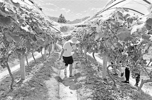 近日,游客在湖北省宣恩县椒园镇一采摘园里采摘葡萄。