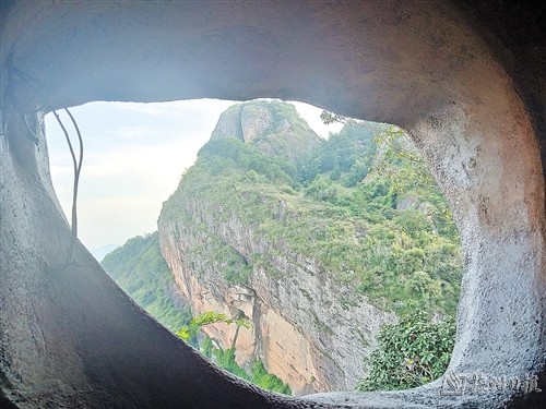 若选择乘坐电瓶车上山,来到半坡的观景平台上,整个南台赤壁的壮丽图景可一览无余;如果把目光从远处收回,聚焦到近处崖壁上的建筑群,便是金粟寺。金粟山原来叫“君竹山”,此间竹影婆娑,风景甚是迷人。金粟寺山门是一花岗岩门框,上书“金粟山”,左右嵌联“现身金粟山合掌,说法南台石点头”,意境高雅而幽深。