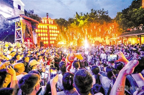 国潮不夜城灯光秀绚烂无比,唐风节目演艺大唐不倒翁少女、唐宫美女巡游、客家综合演出等尽显古典风情,国潮古风夜市上各类网红小吃让游客大饱口福……今年7月21日晚,客天下旅游度假区“世界客都国潮不夜城”试营业第一天,丰富多样的活动内容就吸引了超过1万名游客前来打卡体验。