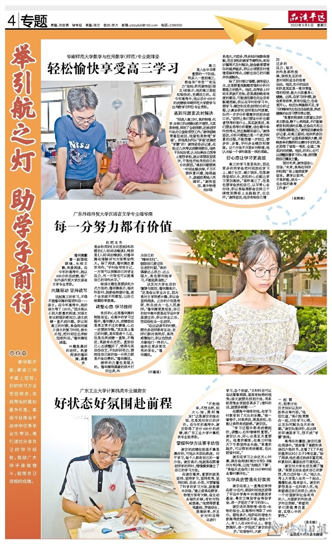 高三是人生中非常重要的一个阶段,很多人一提到高三,都会和“辛苦”“有压力”挂钩,然而谢炜坚(图左)却表示,他的高三是轻松愉快的,充满活力的。在今年高考中,他以总分608分的成绩被华南师范大学数学与应用数学(师范)专业录取。