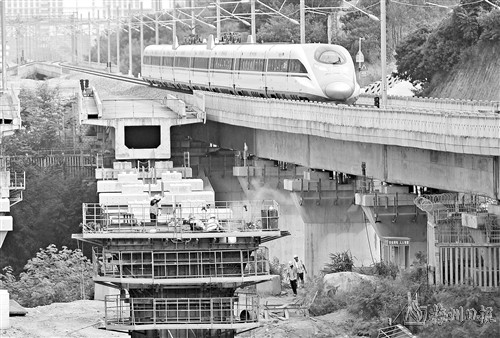 9月6日,中铁四局施工人员在深江铁路深圳段高峰水库大桥上进行主墩施工。