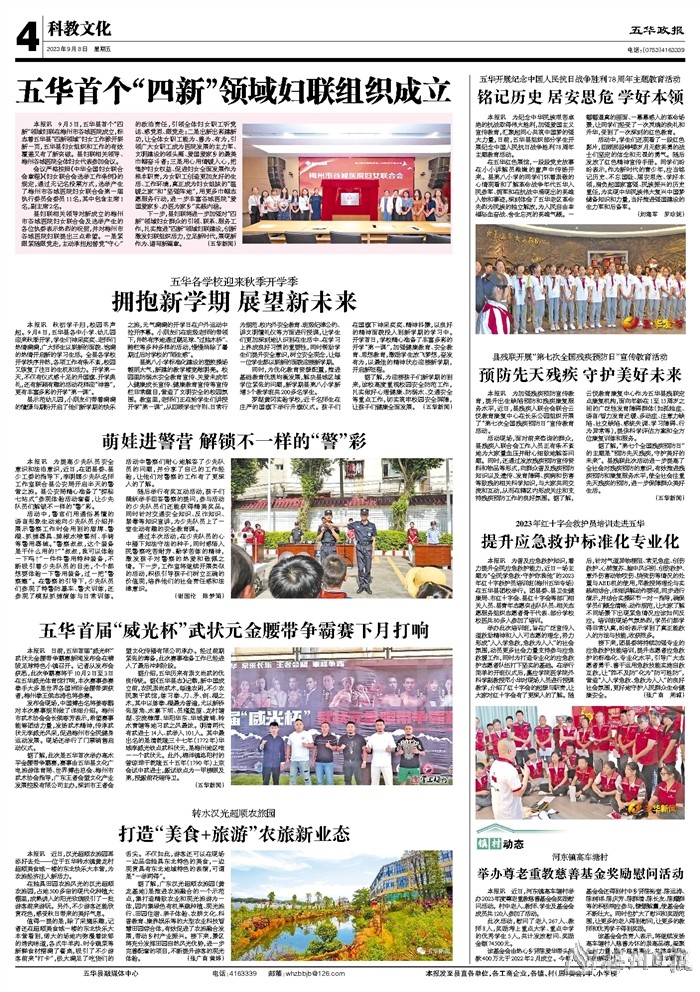 本报讯 秋初学子归,校园书声起。9月4日,五华县各中小学、幼儿园迎来秋季开学,学生们神采奕奕、老师们热情满满,广大师生以崭新的面貌、饱满的热情开启新的学习生活。全县各学校开学秩序井然,各项工作有条不紊,校园又恢复了往日的生机和活力。开学第一天,不仅有仪式感十足的升国旗、开学典礼,还有新颖有趣的活动花样迎“神兽”,更有丰富多彩的开学“第一课”。