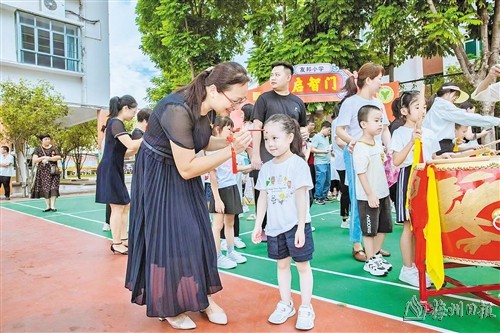 在蕉岭县友邦小学,记者看到,老师们正用笔蘸上朱砂,在孩子的额头正中点上红痣,“痣”意为“启智”,寓意着开启学童智慧,推开知识的大门。随后,孩子们在老师的指导下参加进智慧门、敲启智鼓、学写“人”字等活动,感受传统文化的魅力与熏陶。同时,学校还组织开展了升旗仪式、开学典礼和思政第一课等活动,活泼的身影跃动在生机复苏的校园里,向着新目标出发。活动中,友邦小学校长汤喜梅还为重返校园的学生致辞,她希望孩子们能够培养自信、刻苦、阳光等美好品德,抓住时光,奋发向上。