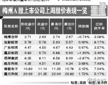 上周A股市场指数维持窄幅震荡,梅州8家A股上市公司上周股价表现为4家上涨,3家下跌,1家打平。