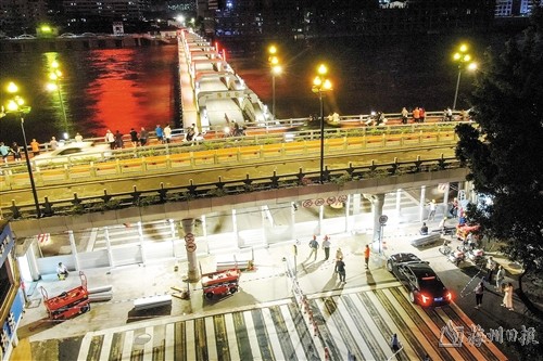 19时20分,梅江桥南端也开始施行交通管制,通明的路灯下工人们加紧安装护板,梅江桥南堤旱闸在洪峰来临前3个小时正式下闸。临近洪峰1小时,在完成了桥面堆沙加重之后,梅江桥北段也完成下闸。