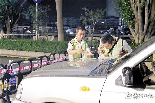 此时梅城天气晴,街道路面干净无恙。梅州市应急管理局的工作人员还在紧盯着洪峰压境的风险监测电脑大屏幕不敢有丝毫松懈,随时准备着做出应对方案;城区的任何一个低洼危险地带都已经拉起了警戒线;沿江堤岸上,公安、消防、应急等人员来回巡逻,路上的警车喇叭播报着劝导群众注意安全早点回家的提醒。