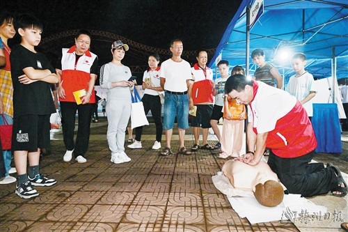 记者在现场看到,前来咨询、问诊的群众络绎不绝。此次义诊活动由东山医院多个学科名医联合义诊,涵盖了皮肤科、消化科、耳鼻喉头颈外科、眼科、血液内科、肿瘤科等多个临床科系。同时,现场开展了测血压、心电图、B超以及保健咨询、心理咨询、体质检测等多个免费健康体检项目,解答市民关于日常保健和疾病预防控制方面的问题,引导市民增强健康意识、树立健康生活理念。此外,现场还有市红十字会面对面传授市民实用版急救操作(如下图,钟小丰摄),市中心血站组织的血型检测、爱心献血活动,市民政局下属单位及相关科室组织的养老服务政策宣传,吸引了不少市民前来参与了解。