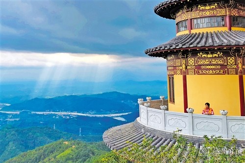 山顶风凉万象清,梅江如练舞轻盈。 穿云辉似佛光泻,照破五阴心自明。