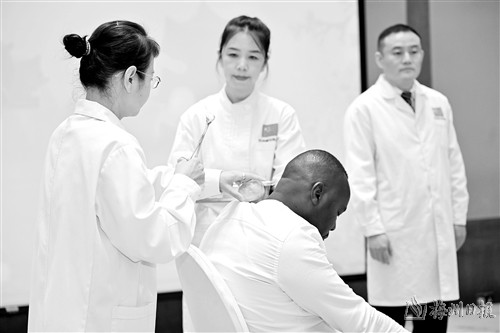 9月11日,在科威特大穆巴拉克省,中国(吉林)第15批援科威特医疗队队员在纪念仪式现场展示中医拔罐。