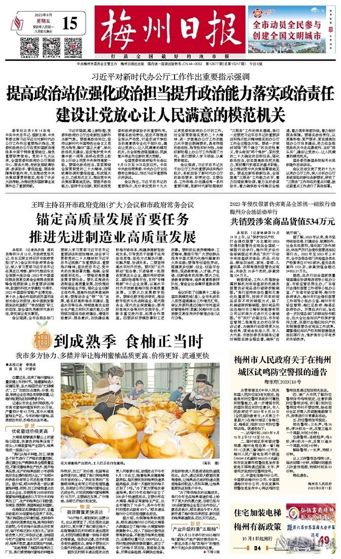 记者从市农业农村局了解到,多年来,我市大力发展柚产业,创建了梅州柚1个国家级、4个省级现代农业产业园,以及1个国家级产业集群。同时,我市以柚果为原料开发了啤酒、果脯、饮料、月饼等深加工产品,众多产品品牌还获得全国名特优新农产品、“粤字号”农业品牌等荣誉。“接下来,我们将持续做好梅州柚‘12221’市场体系建设工作,打造梅州节庆柚、亲情柚、长寿柚、苏区柚、致富柚‘五颗柚’,持续做强做优梅州柚品牌。”市农业农村局副局长陈爱东说。