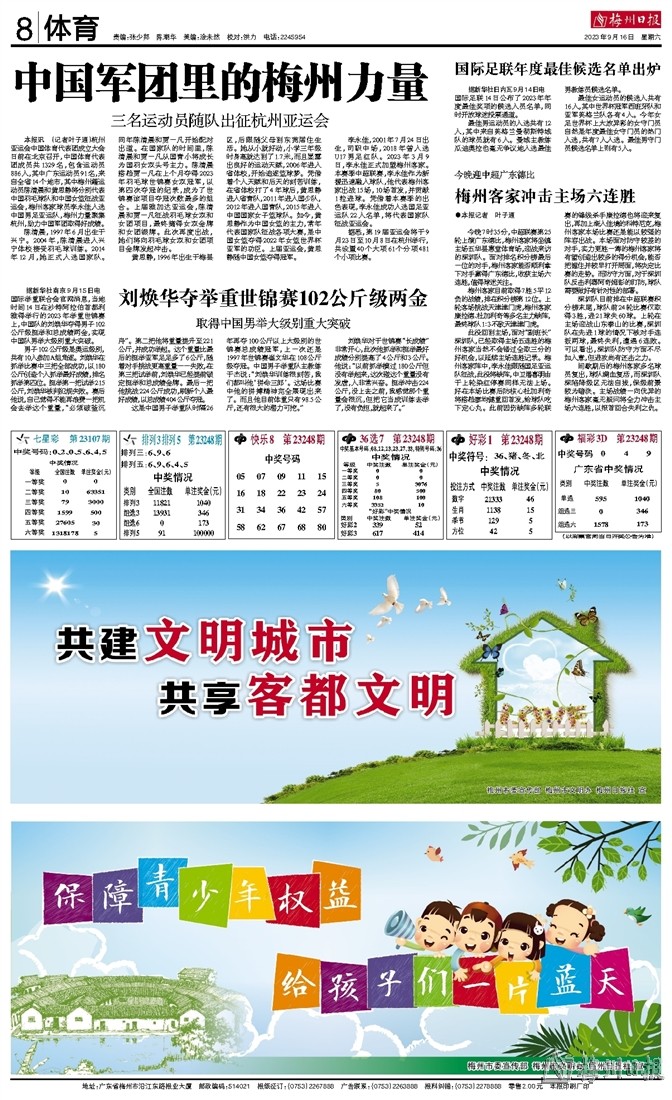本报讯 (记者叶子通)杭州亚运会中国体育代表团成立大会日前在北京召开,中国体育代表团成员共1329名,包含运动员886人,其中广东运动员91名,来自全省14个地市,其中梅州籍运动员陈清晨和黄思静将分别代表中国羽毛球队和中国女篮征战亚运会,梅州客家球员李永佳入选中国男足亚运队,梅州力量聚集杭州,助力中国军团取得好成绩。
