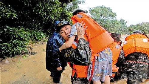 7日上午,武警梅州支队某部官兵接到上级指示后迅速响应,集结抢险救援小分队,携橡皮艇、应急灯、大绳、救生衣等应急物资火速前往丰顺县隆烟村参加防汛救援任务,会同地方救援力量转移受灾群众。连续奋战5个小时,参战官兵无一人退缩、无一人叫苦,始终保持英勇顽强的战斗作风,会同驻地应急救援力量成功转移被困群众27人,赢得当地政府与驻地群众的高度赞誉。